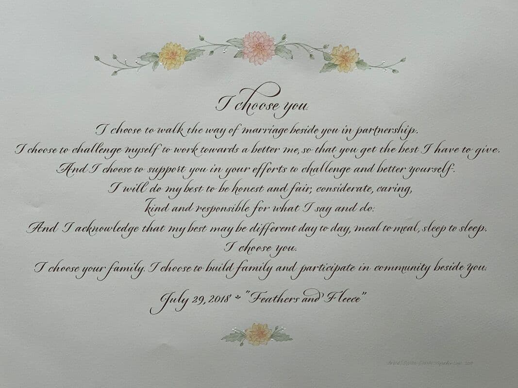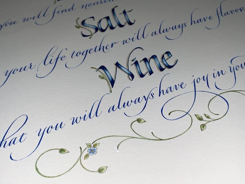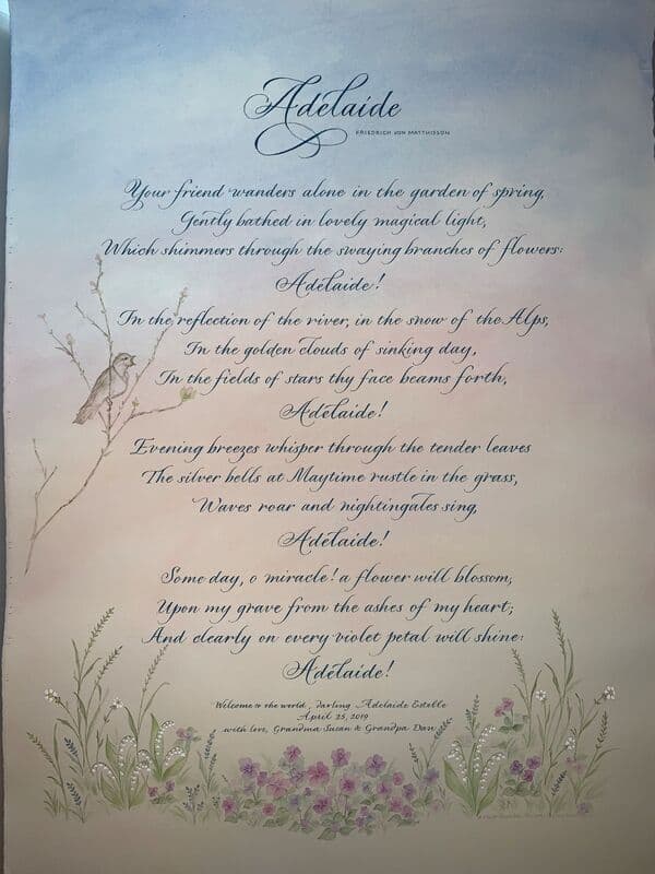 Explore the Gallery This collection offers a glimpse into the breadth of my work- from refined calligraphy and illuminated letters to more expressive, illustrative pieces that explore color and texture. Each commission is thoughtfully tailored. Through a collaborative consultation process, we’ll discover the most compelling way to bring your message to life.
